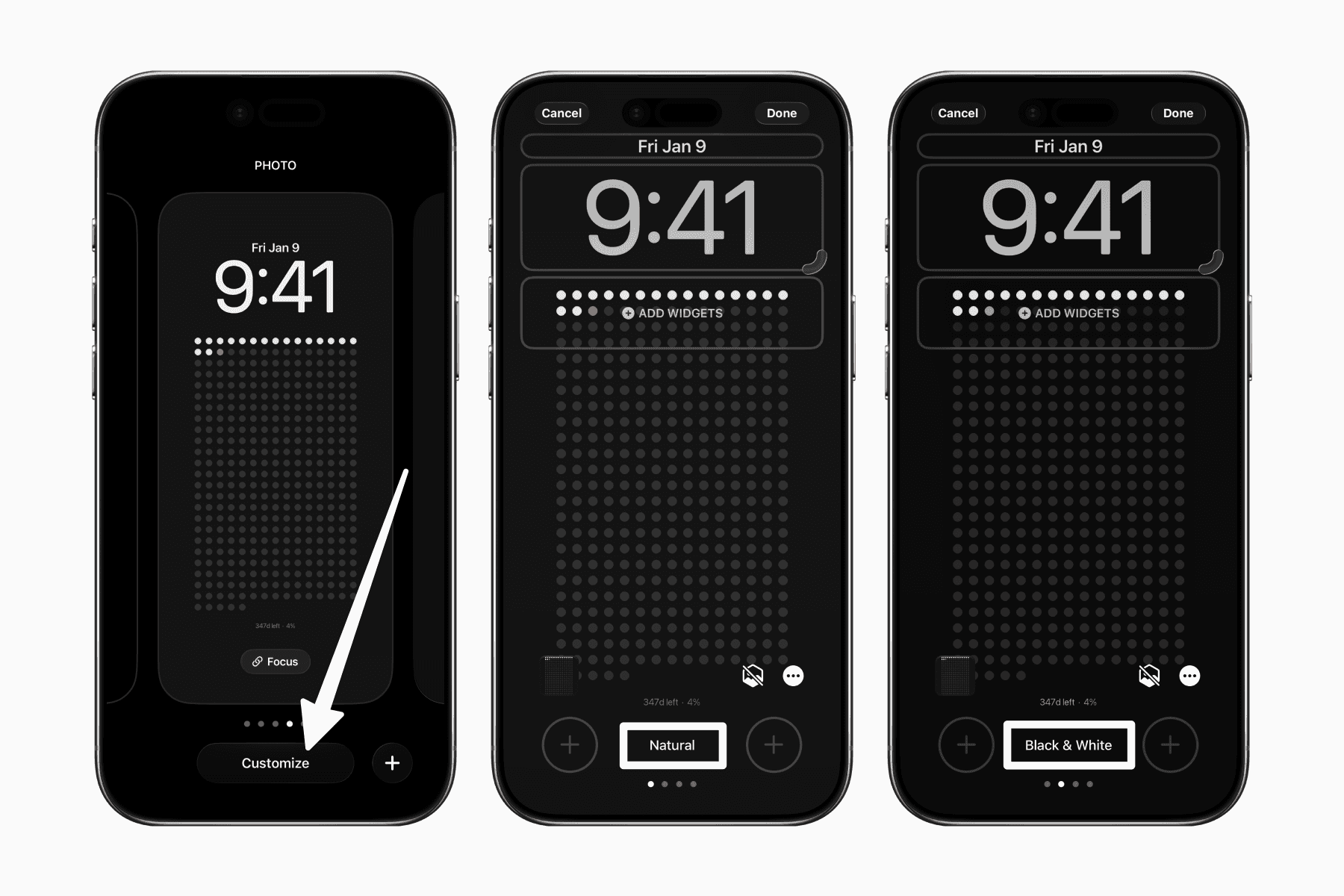 Simply press and hold your lock screen, then click "Customize" when it appears. Next, swipe until the default "Natural" is set to "Black & White."