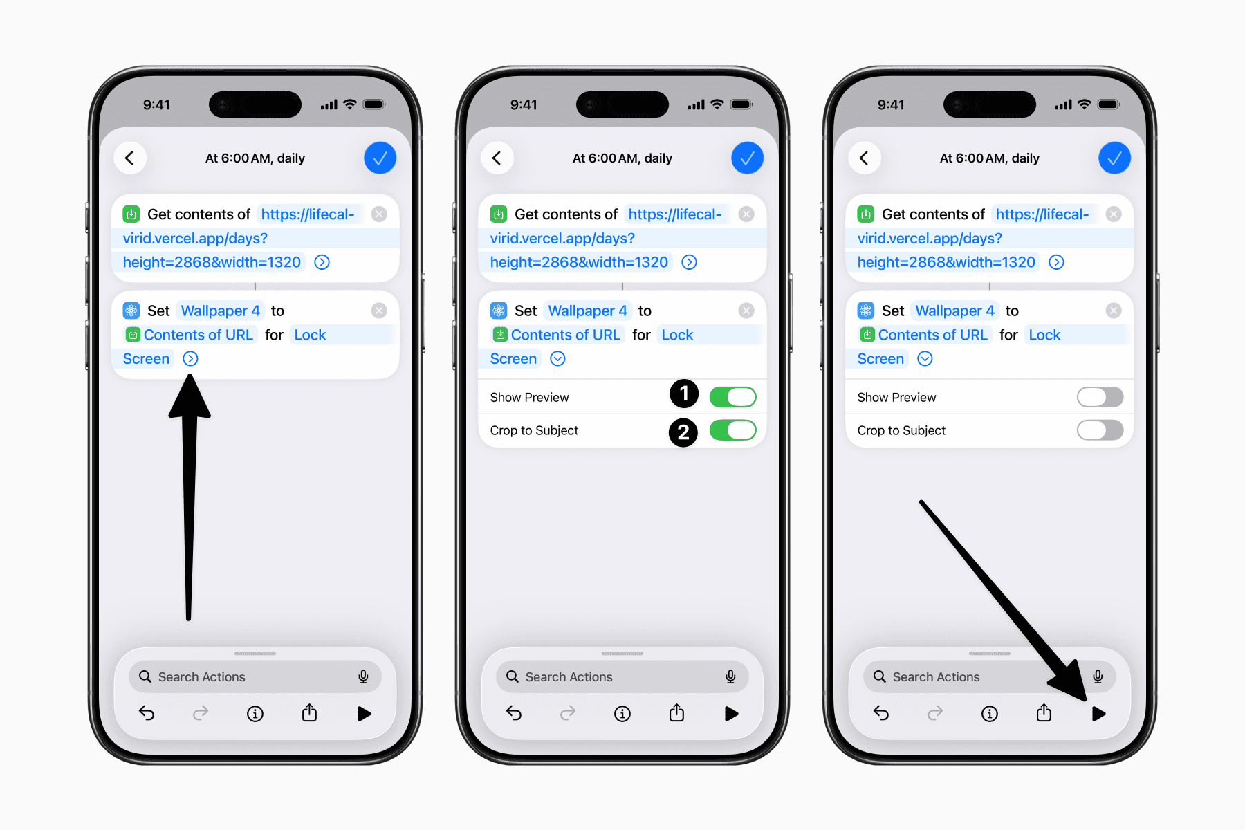 Finally, tap on the chevron of the “Set Wallpaper Photo” action to reveal the options to toggle off both “Show Preview” and “Crop to Subject”.